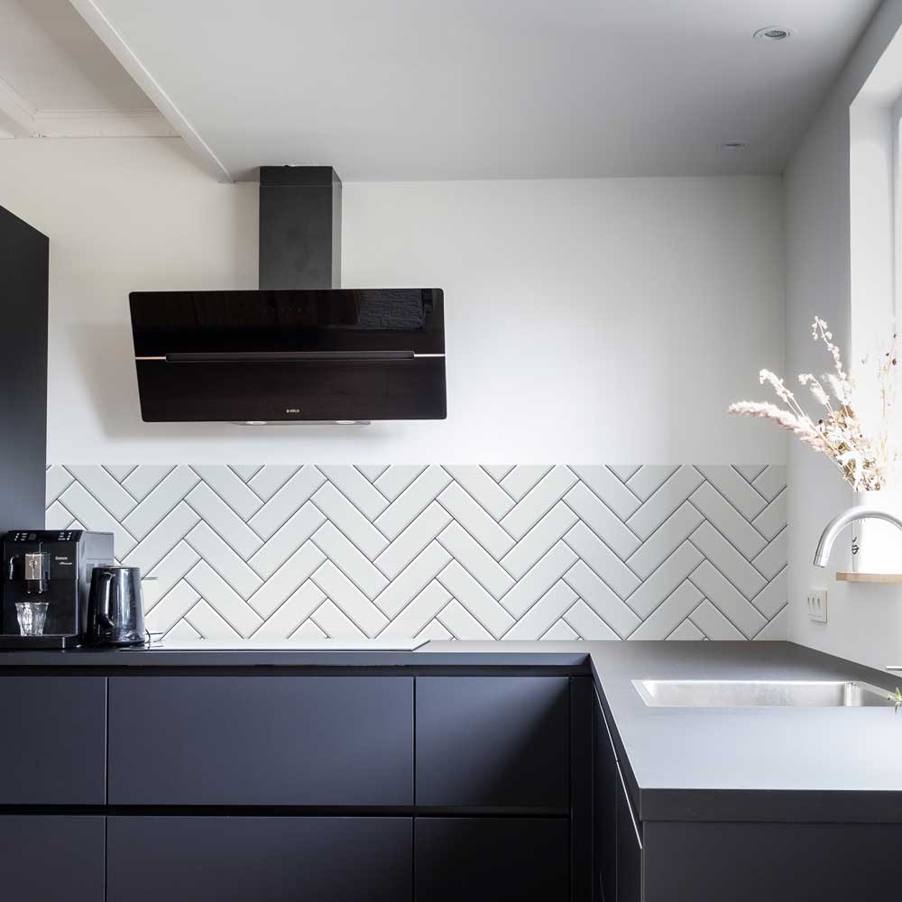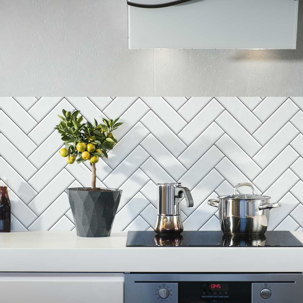 It doesn't get any more classic than a white Herringbone tile pattern! Class up your kitchen, style your bathroom, even back your fireplace with this beautiful vinyl covering.